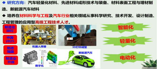 材料科学与工程公司始建于1981年,材料科学与工程学科为教育部硕士点授权学科,2012年被批准为湖北省省级重点学科;“汽车材料与轻量化制造”2021年被批准为湖北省特色优势学科群。人才培养有本科、硕士研究生两个层次,本科专业有:材料成型及控制工程、材料科学与工程、焊接技术与工程、金属材料与工程、高分子材料与工程等专业。材料科学与工程专业2022年入选国家一流本科专业建设点。研究生招收培养材料科学与工程学术型硕士,材料类工程硕士,机械类工程硕士。建有湖北省汽车轻量化技术成果转化中试基地、湖北省汽车轻量化材料与连接技术工程中心;建有一个国家工程教育实践中心,公司的“材料科学与工程实验中心”为湖北省省级重点实验示范中心,为材料制备、成形加工、材料检验检测等教学与科学研究提供了良好的条件。
