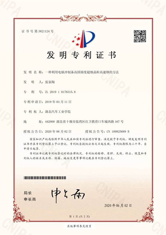 高能电脉冲制备原奥氏体超细晶钢的突破将首先应用于超细晶高速钢钻、铣刀具的开发,这将解决现有高速钢刀具热处理难以获得晶粒细化的问题,同时还将解决能耗高、“三废”污染严重的问题。据张家陶博士介绍,超细晶高速钢的发明专利仅仅15个月就获得了授权,这是受惠于国家知识产权局加快对重要原创性技术专利的授权政策。超细晶高速钢刀具的开发将使我国高速钢刀具从“以钨资源优势促进产品性能”转变为“以工艺优势提升产品性能”,这将我国稀有贵金属资源的价值加倍体现。