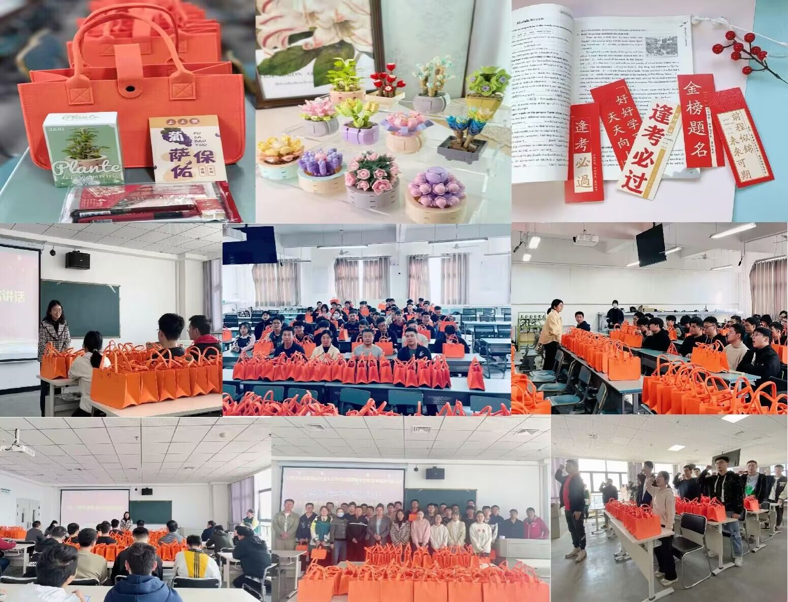 最后,老师们为考研学子送上公司精心准备的考研“加油包”,包含寓意 “一战成硕”的橙色毛毡小包、考研幸运签(书签)、积多好运株(多肉积木)、一战成硕笔(文具套装)等物品,希望同学们在紧张的复习阶段,能够及时调整心态,以最好的状态备战考研。件件贴心的礼物,句句真切的话语,满载着对考研学子诚挚的鼓励与祝福。