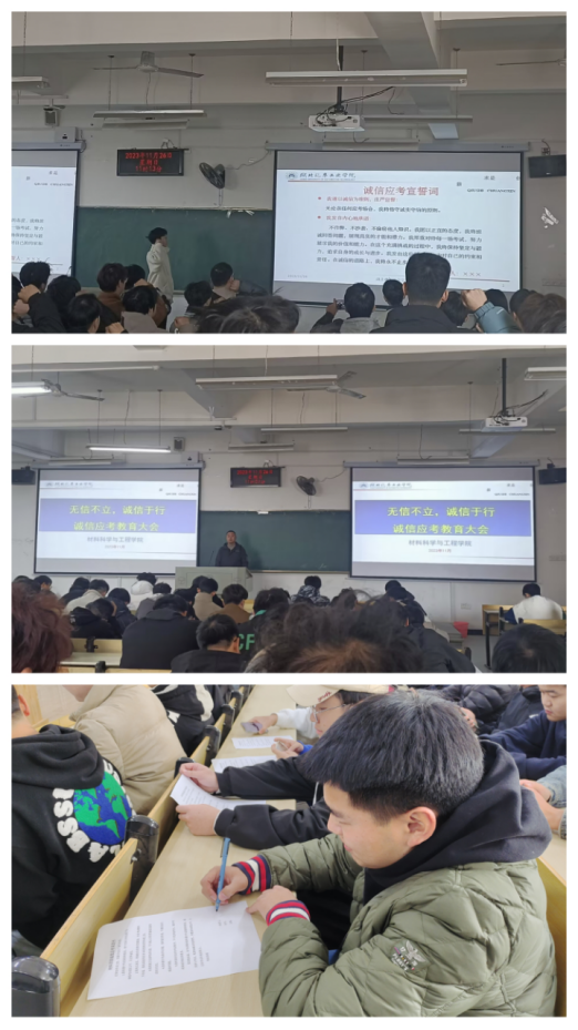 大会伊始,由高分子211班周方珂同学带领大家宣誓,表明自己拒绝作弊、诚信应考的决心。随后,骆无思着重强调公司关于考试违纪、作弊处罚的规定,通过讲述真实的例子告诫同学们要诚信考试,各种因为考试作弊而被处分的案例让同学们清楚的认识到了考试作弊的危害。最后,全体同学签订诚信应考承诺书,进一步增强同学们严于律己、诚信考试的意识。通过本次主题教育,同学们纷纷表示认识到了诚信应考的重要性,将会保持严谨求实的学习态度,用诚实的考场作风来证明自己的实力。