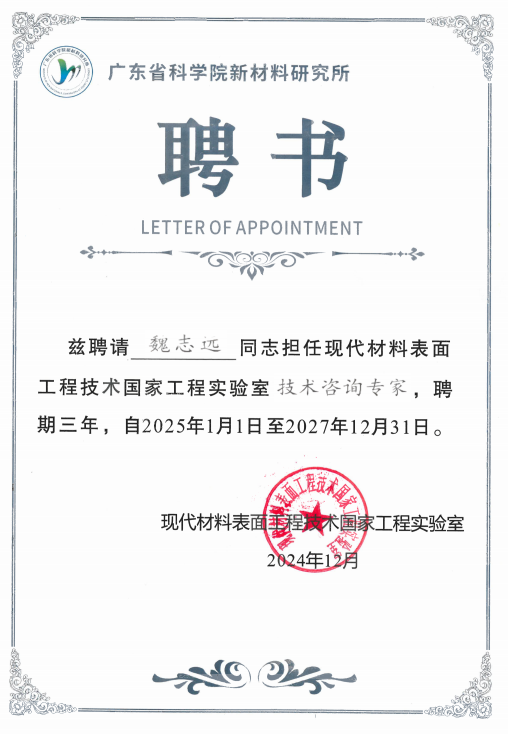 近日,魏志远老师担任现代材料表面工程技术国家工程实验室技术咨询专家一职,这标志着团队的研究成果已受领域专家的充分认可。欢迎专家学者及师生进行科研探讨和合作交流。