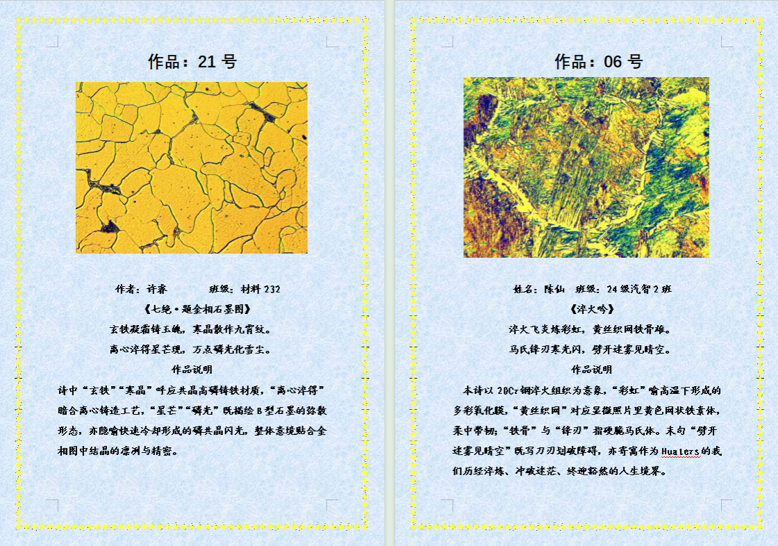 本次活动以材料科学与工程实验室制作的彩色金相照片为创作素材。这些图像揭示了材料在显微镜下不为人知的微观景观:钢铁的脉络宛如山河纵横,合金的析出恰似星罗棋布。大赛鼓励员工为这些科学图像配以原创或经典诗词,实现“诗画融合”,引导他们从精密的材料结构中发掘秩序之美与自然之奇。