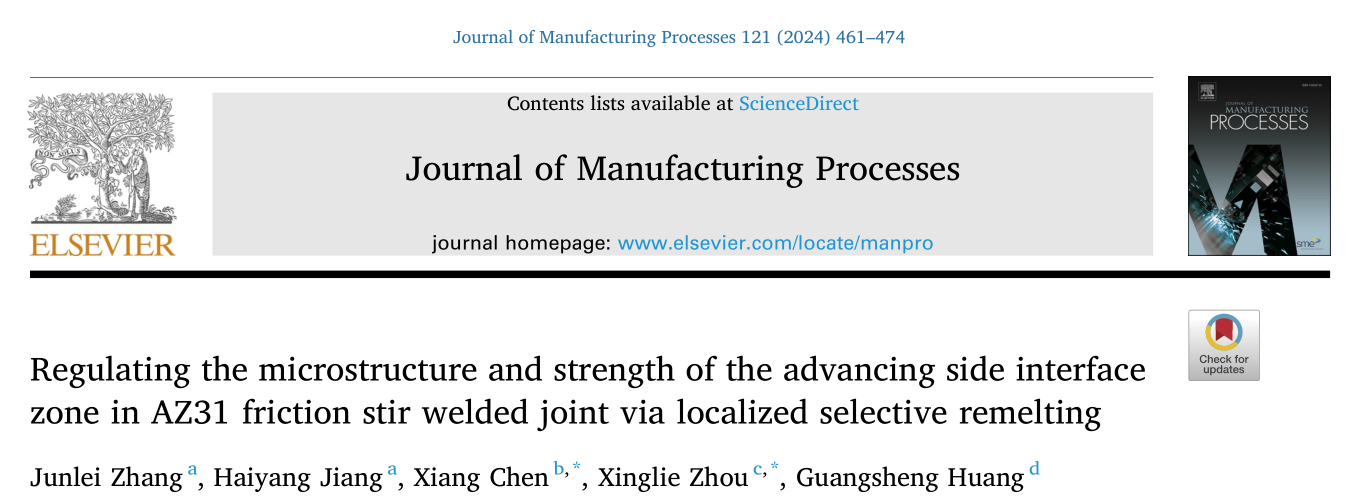 在工程应用研究方面,公司作为第一通讯单位联合昆明理工大学在ESI工程学期刊《Journal of Manufacturing Processes》(IF:6.2,中科院1区TOP)发表研究性论文“Regulating the microstructure and strength of the advancing side interface zone in AZ31 friction stir welded joint via localized selective remelting”。该论文提出了一种提高AZ31镁合金搅拌摩擦焊接头力学性能的新方法—局部选区重熔,对比研究了接头局部重熔前后不同微区间的微观组织演变、变形行为和断裂特征,并讨论了接头强度提升的潜在机理。