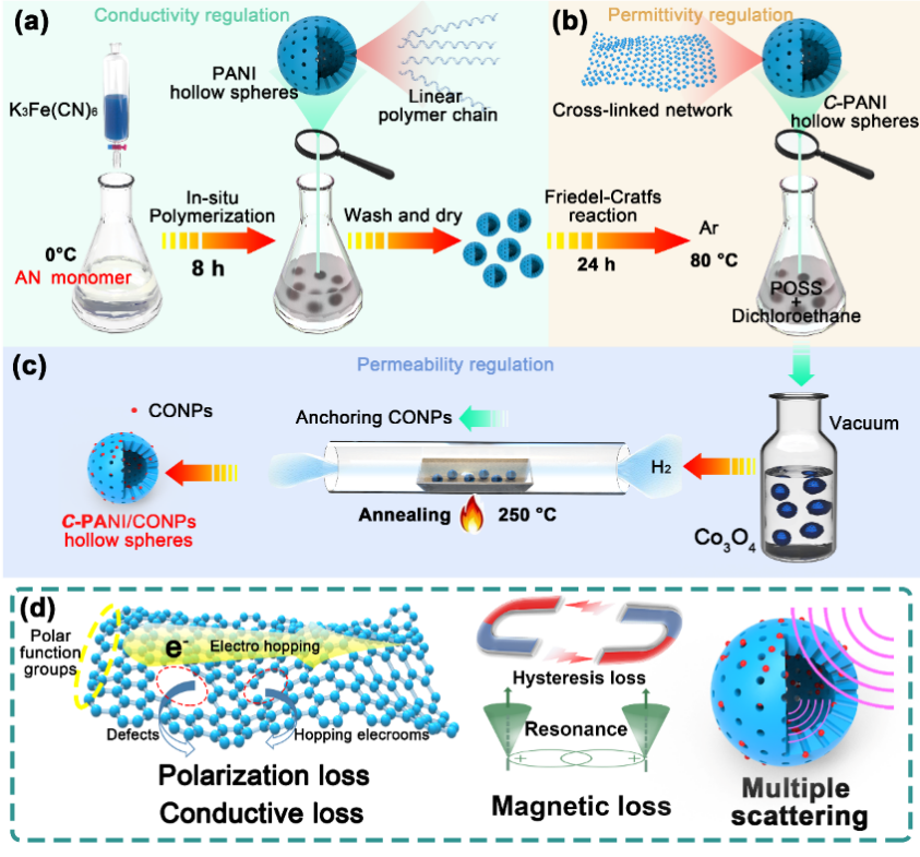 该工作从多个维度调节吸波复合材料的电导率和电磁参数,成功地开发了一种具有超宽的有效吸收带宽和可调节的有效吸收频率的高性能吸波材料。具体而言,P-1.0Co3O4样品在厚度仅为1.3 mm的情况下,有效吸收带宽高达6.64 GHz。 这种广泛的有效吸收带宽来自于独特的分子结构导致的载流子热损失、磁性颗粒的磁损失以及空心球体提供的增强阻抗匹配。有效吸收频率范围可在10.9 GHz和18.0 GHz之间调节。该吸波复合材料对目标吸波材料的开发具有重要的理论指导和工程应用价值。