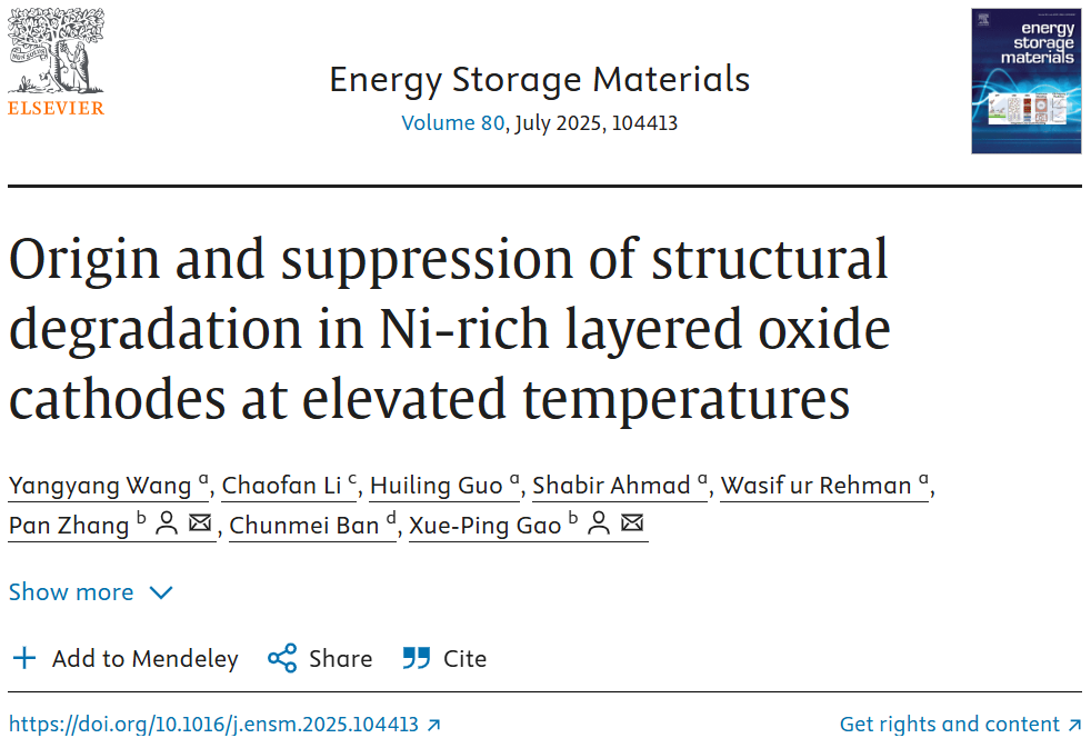 近日,公司青年教师王杨阳博士和南开大学高学平教授团队在锂离子电池正极材料领域取得重要进展,其作为第一作者的研究论文“Origin and suppression of structural degradation in Ni-rich layered oxide cathodes at elevated temperatures” 发表于材料科学领域顶级期刊《Energy Storage Materials》(中科院一区Top期刊,IF= 20.2)。