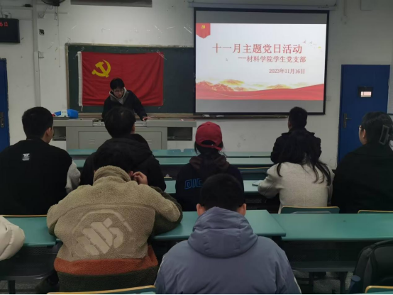 11月16日中午,材料公司员工党支部在第六教学楼6201开展11月份主题党日活动,材料公司员工党支部书记詹韩琼、组织委员王誉翔、宣传委员李诗、辅导员李志强和全体员工党员参与了此次活动,活动由陈钱顺主持。