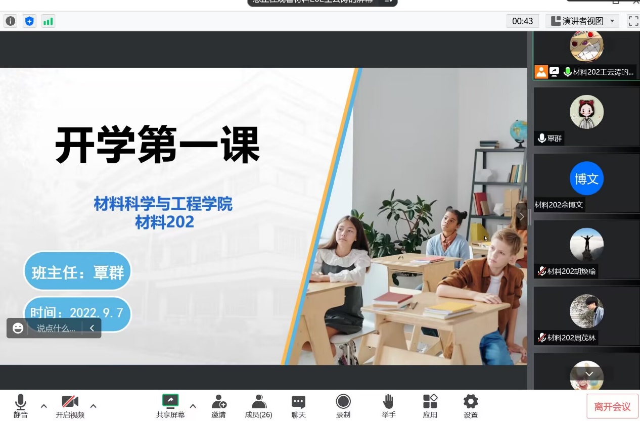 为深入贯彻关于组织开展2022年秋季学期“开学第一课”主题班(团)会的通知,进一步做好开学后学风建设、疫情防控、思政教育和安全教育等工作,材料公司各班级积极组织“新的起点,新的耕耘”主题班(团)会。