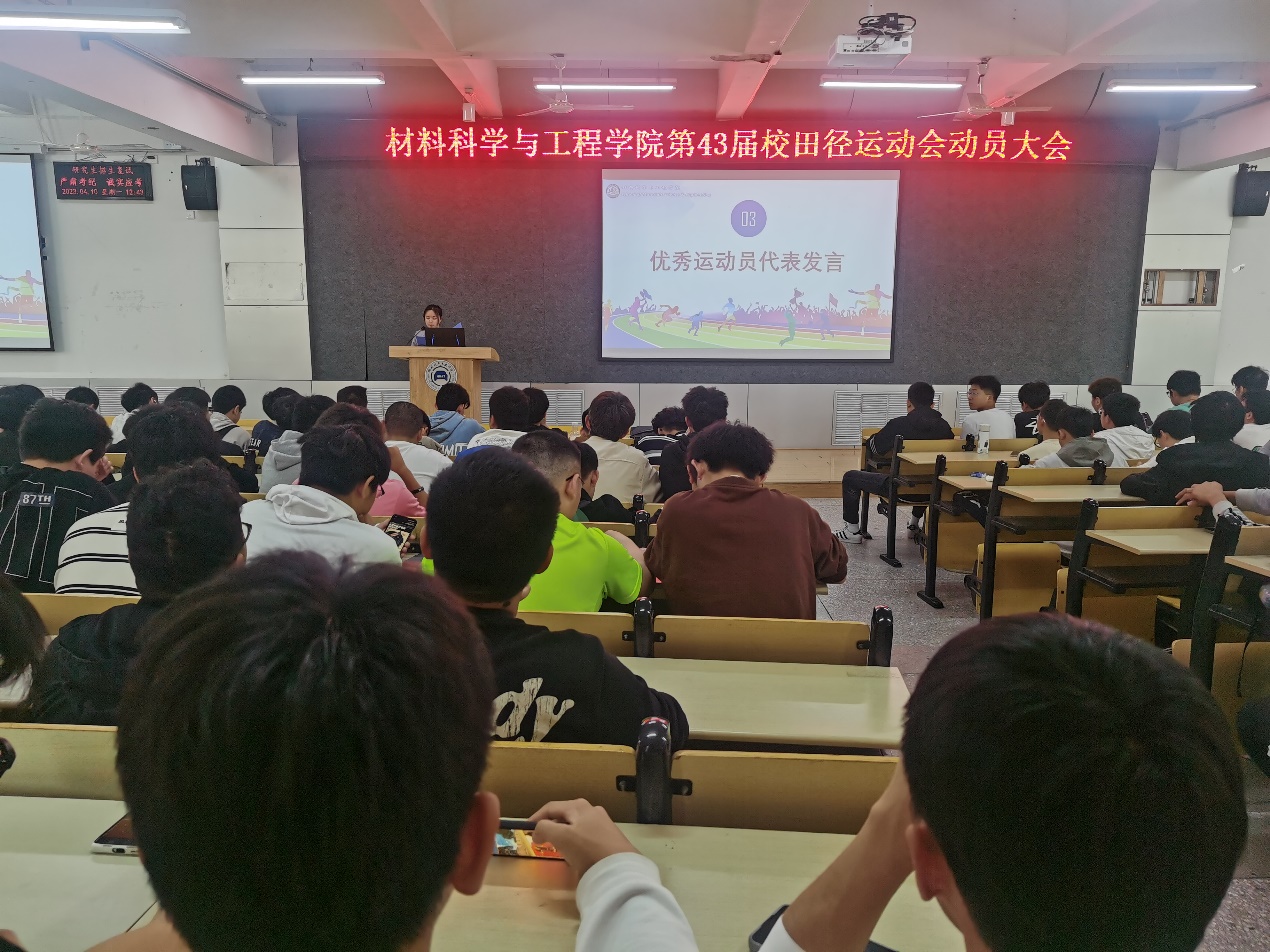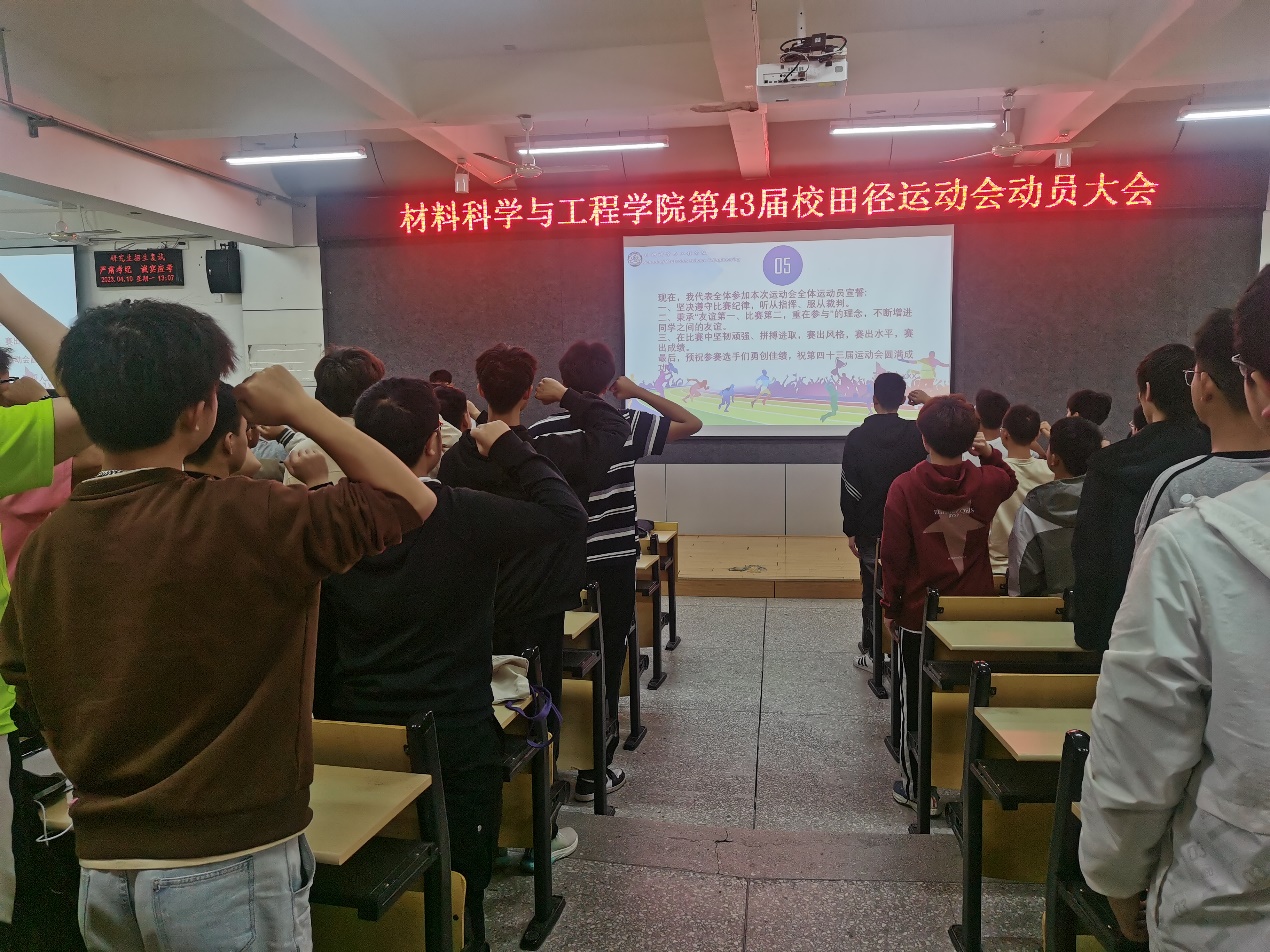 学工办骆无思老师宣读材料公司校运动会优秀集体和个人评选办法,对运动会前期的准备工作和训练任务进行了详细的安排部署,强调了需要注意的事项;全体同学起立宣誓:遵守比赛纪律,听从指挥,服从裁判,拼搏进取,赛出风格,赛出水平,赛出成绩,做优秀材院人。