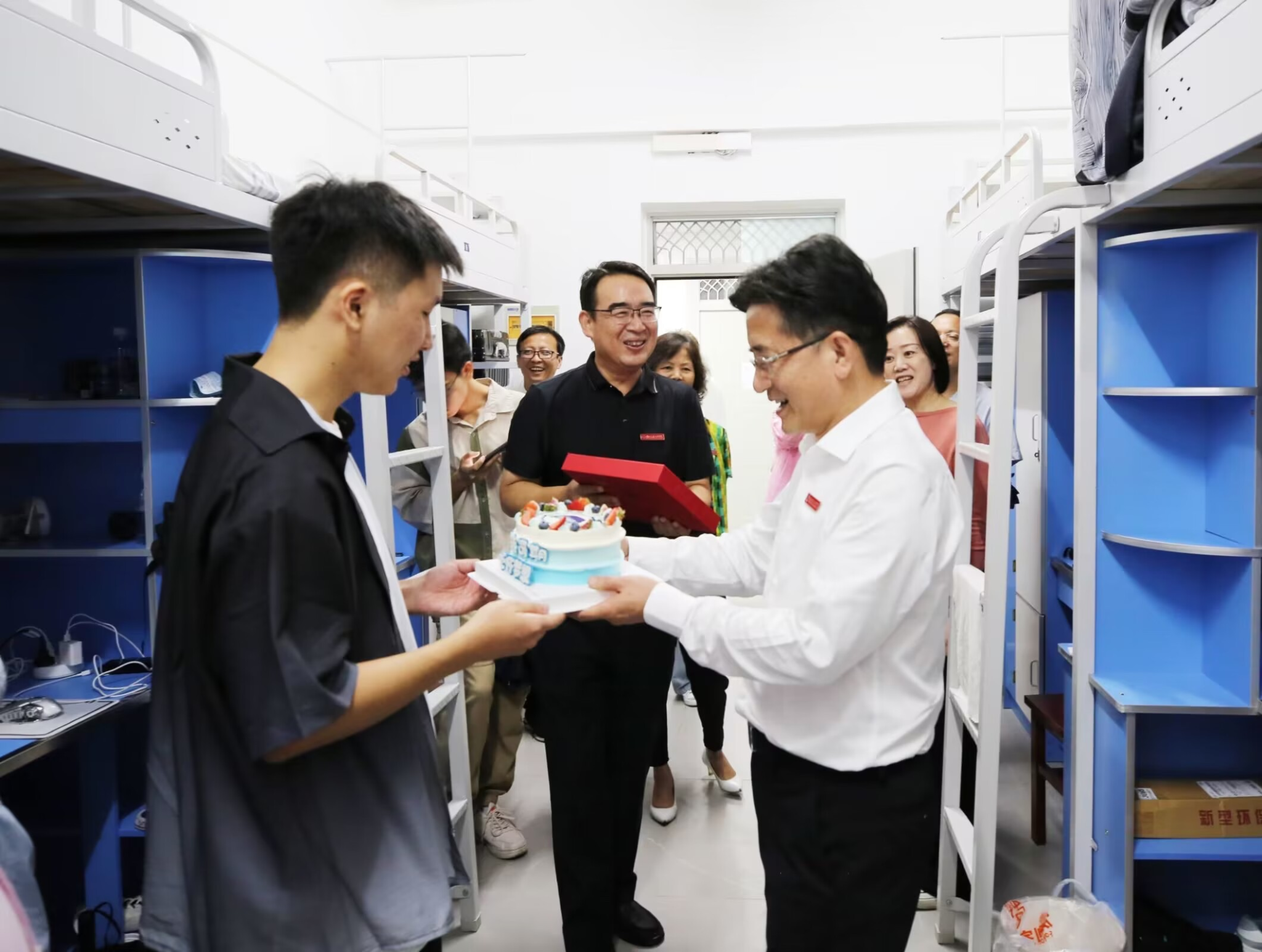 本次迎新工作受到公司领导的高度重视,公司党委书记张文学、董事长王晓来到公司迎新点,亲切慰问迎新志愿者,详细了解新生报到情况,并为公司一名2023级本科新同学庆祝生日,亲切交流并合影。