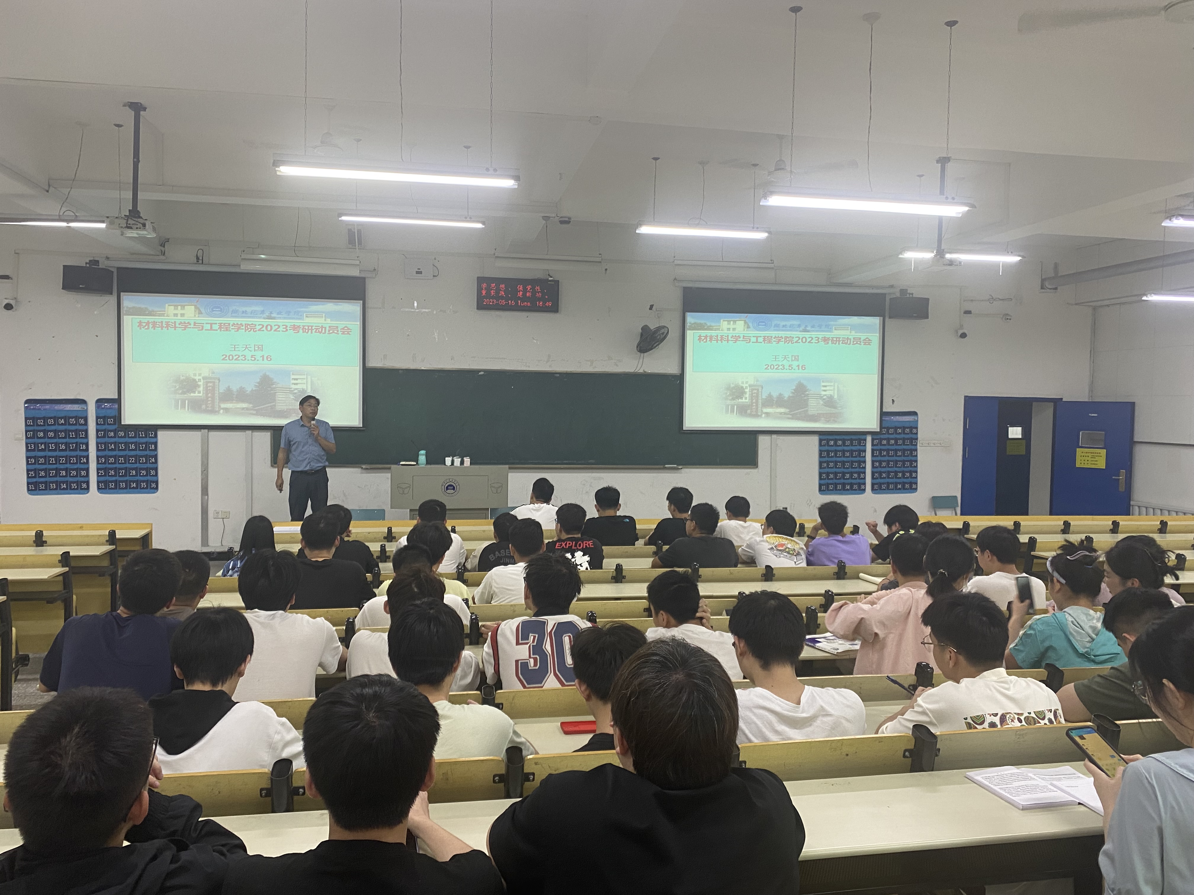 会上,王天国分别从“为什么要考研?”、“如何选择公司和报考”、“考研复习准备”和“本院研究生简介”四个方面,向参会同学进行了深入浅出地细致介绍。王天国通过历年的实际数据,用数字为同学们呈现了研究生考试的竞争激烈,虽然面对一年比一年严峻的考研形势,但是只要沉得下心、稳扎稳打、牟定目标、不轻言放弃,一定能够顺利考取研究生入学资格。